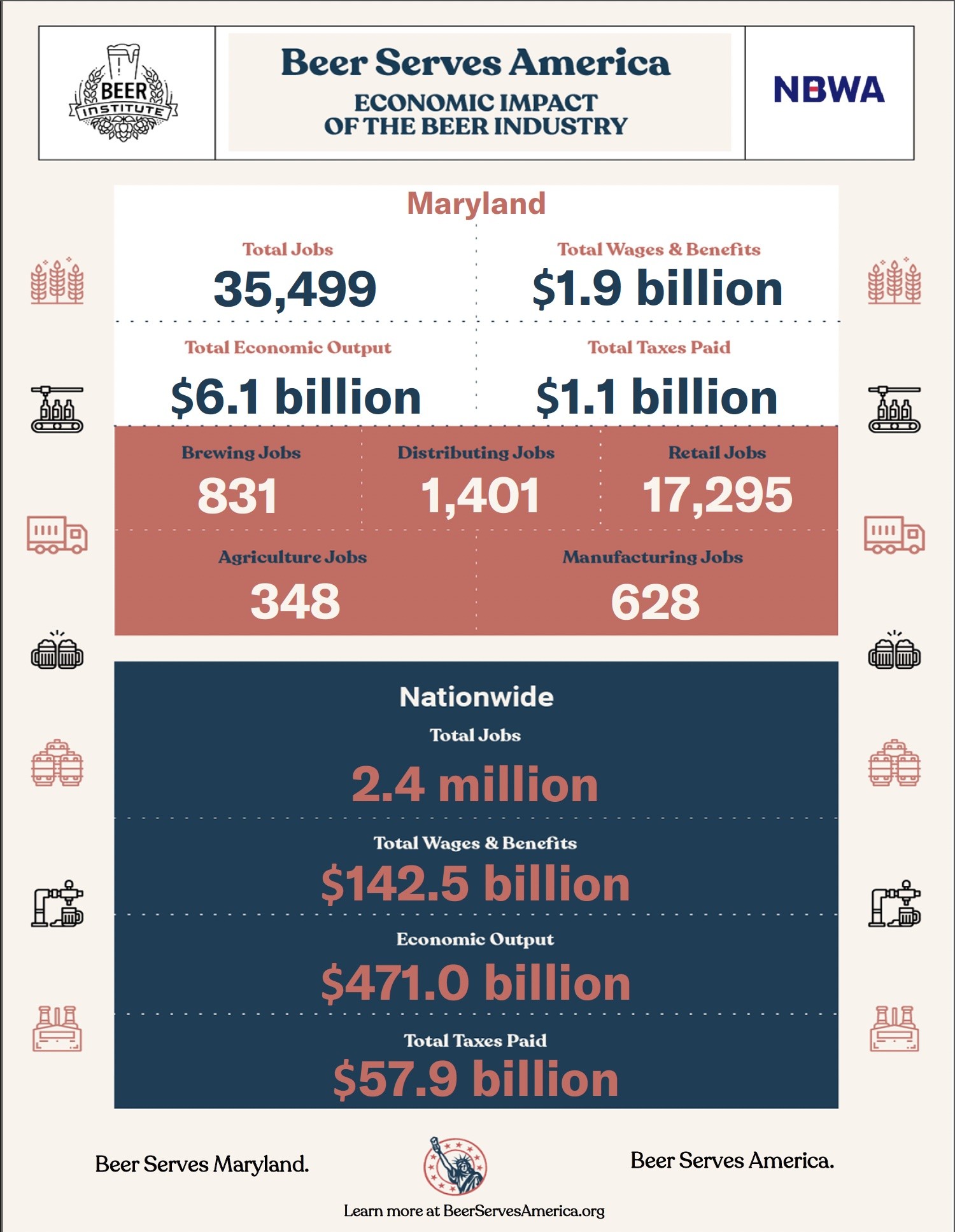 Beer makes a big economic impact in Maryland, according to the new Beer Serves America report released by the National Beer Wholesalers Association and the Beer Institute. In Maryland, more than 35,000 enthusiastic Americans make their career in the beer industry, which contributes $6.1 billion to the state’s economy while generating $1.1 billion in taxes that support local communities.