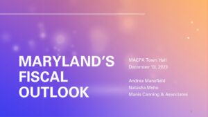 Members of the Manis Canning & Associates (MCA) team, Natasha Mehu and Andrea Mansfield, presented to the Maryland Association of CPAs this week discussing the State’s fiscal outlook. The presentation titled “Maryland’s Fiscal Outlook – The Good, the Bad and the Ugly” shared data and information on the State’s near-term budget outlook, fiscal year 2025, and pressures creating significant cash and structural shortfalls in fiscal years 2028 and 2029.